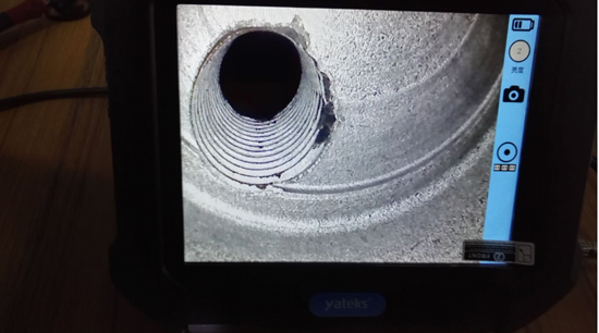 上圖中為亞泰光電SIE超清系列視頻內(nèi)窺鏡在金豐汽配廠檢查排氣管的實拍圖,很明顯的可以看出該排氣管壁存在微小的焊接漏洞.